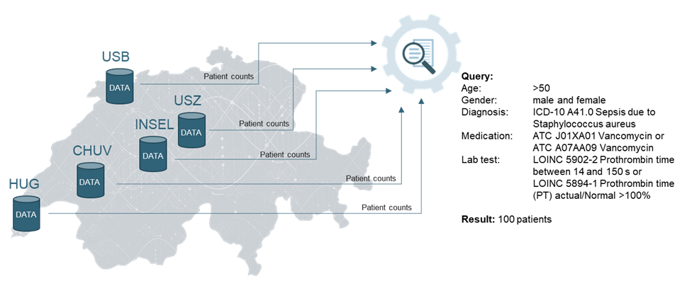 Information retrieval systems enabling researchers to query for specific clinical information of patients have so far been limited to individual clinics or single hospitals. With the new Federated Query System (FQS), established in the realm of the Swiss Personalized Health Network (SPHN), it is now possible to search for fully anonymized clinical information across all five university hospitals, while allowing the hospitals to retain full control over their data.